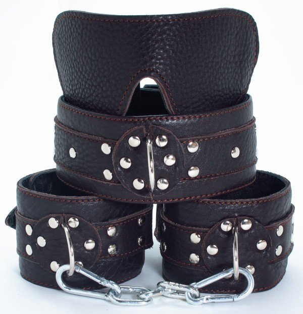 Наруч­ники изнутри отде­ланы неж­нейшей нату­раль­ной кожей, что обес­пе­чи­вает мак­сималь­ный комфорт ниж­нему! Наруч­ники деко­ри­ро­ваны метал­ли­че­скими клеп­ками и имеют D-​образные метал­ли­че­ские кольца, к кото­рым можно крепить любые девайсы! Соеди­нены наруч­ники между собой корот­кой метал­ли­че­ской цепью на кара­би­нах. Застеги­ваются при помощи ремешка. Регулируемые