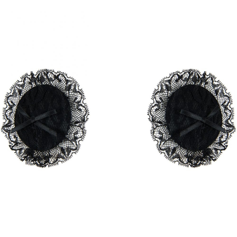 Пэстис выполнены в черном цвете и декорированы восхитительным кружевным материалом. Фик­си­руются на соске при помощи клейкого слоя, совершенно без­опас­ного для кожи. Пэс­тис много­ра­зо­вые: после исполь­зо­ва­ния промыть и при­кле­ить защит­ную пле­ночку